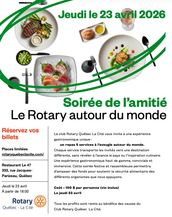 Dans le cadre des soirées de l’Amitié du Rotary, le club Rotary Québec La Cité vous invite à une expérience gastronomique unique :